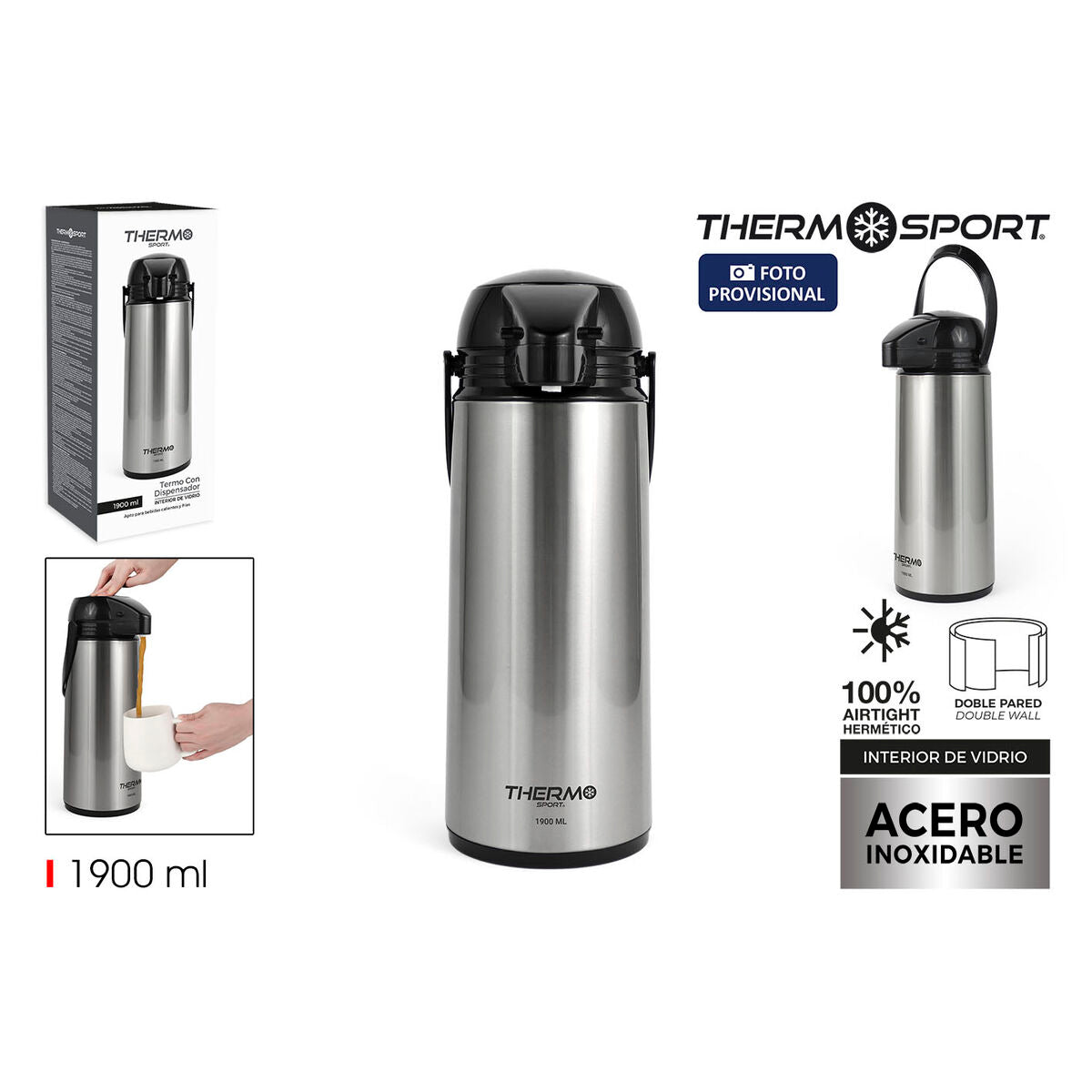 ThermoSport-termokanden er en dispenser designet til at bevare den optimale temperatur på dine væsker takket være dens konstruktion i stål, som sikrer høj modstandsdygtighed og holdbarhed. Med en finish i sølvfarve kombinerer dette produkt funktionalitet og stil og passer til både private og professionelle miljøer. Dens kapacitet på 1,9 liter er ideel til at servere varme eller kolde drikke til flere personer uden hyppige genopfyldninger, hvilket gør den praktisk til møder, kontorer eller udendørs aktiviteter. Termokanden har desuden et integreret dispenser-system, der gør serveringen nem og kontrolleret, undgår spild og sikrer en enkel og hygiejnisk brugeroplevelse. Kombinationen af dens funktioner som kande, termokande og dispenser gør den alsidig og i stand til at holde temperaturen i lang tid uden at gå på kompromis med brugervenligheden. ThermoSport-termokanden er en effektiv løsning for dem, der har brug for at bevare drikkevarer ved ønsket temperatur med et robust og funktionelt design.
